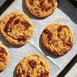 Using a wooden toothpick or skewer, drag the caramel across the surface of the dough to create a swirled pattern. The biscuits will spread significantly during baking, so spread the caramel generously. Bake for 11 to 13 minutes, until the edges achieve a golden hue. Allow them to cool completely on the tray to set their structure before serving.